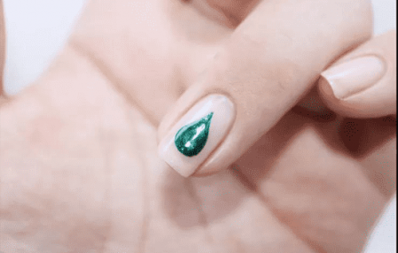 第三步:按同样的方法在无名指上画出绿色珠光水滴图案,照灯60秒。