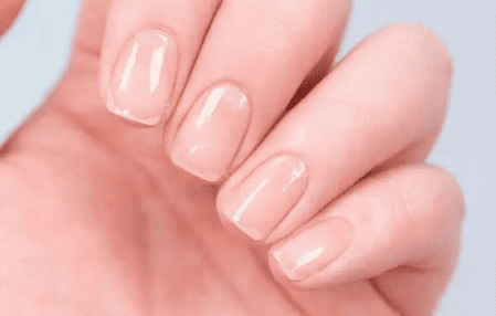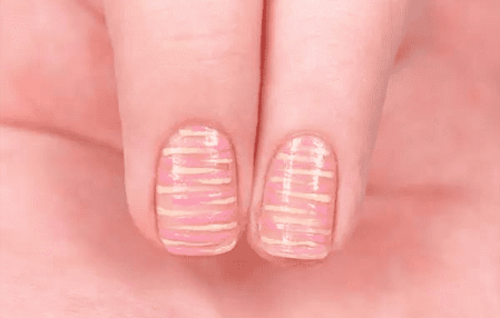 Step2:在中指和无名指上用嫩**指甲油画横线,如图所示。