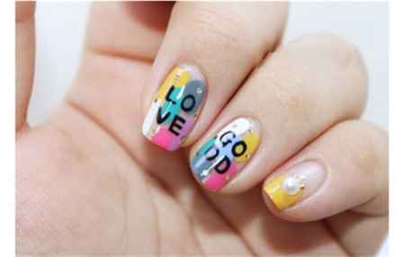 准备好所需的甲胶和工具,修剪指甲;用勾线笔蘸取各色甲油在中指上画出色块;无名指也用同样的方法画出图案;用勾线笔蘸取黑色甲油在中指画出LOVE;在无名指上画出GOOD;在食指和小拇指的前缘画出黄**块。在后缘刷上粘贴胶,贴上珍珠和金色铆钉;最后为甲面上一层封层,照灯60秒就可以了。