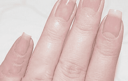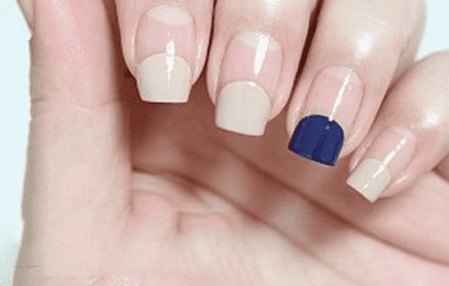 第二步:在指甲前缘分别用米色和蓝色甲油刷出反法式,如图,照灯60秒。为了颜色饱满再刷一遍,照灯60秒。