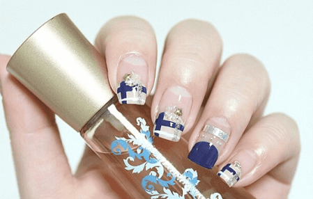 法式美甲叠加格子图案,选择米色与蓝色甲油搭配更显成熟、知性,很适合职业女性。