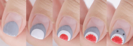 用灰色甲油在大拇指前缘刷出鲨鱼的大致形态,待干。再用白色甲油画出鲨鱼的嘴巴大致色块,待干。再蘸红色甲油画出色块并用笔向外勾绘出鲨鱼的牙齿,待干。