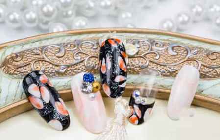 07-15 阅读(1783)橙色带点白的花朵从黑暗里透出来,展现给大家看它妙曼的身姿。下面一起来学习这款橙花美甲吧!