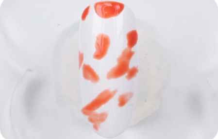 第一步:完成白色打底。用橙色甲油胶随意地在甲面上涂抹出颜色,照灯。