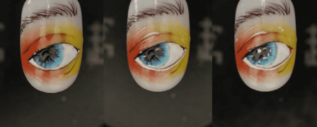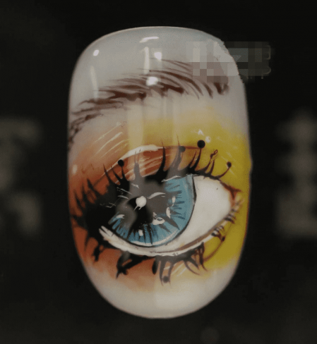 为了颜色更加饱满,眼睛周围的颜色再晕染一遍,照灯固化。用勾线笔蘸黑色彩绘胶(Art02)画出瞳孔的黑色部分并勾绘出丝丝的纹理,照灯固化。再蘸白色彩绘胶(Art01)画出眼睛周围丝丝的纹理和眼睛的高光,照灯固化。