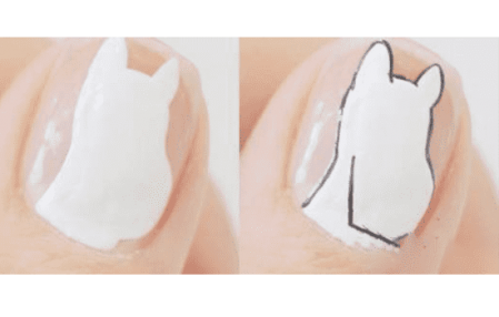 第二步:接着使用勾线笔沾取白色甲油画出姆明的外轮廓并填充内部,照灯60秒。勾线笔沾取黑色甲油画出轮廓线条,照灯60秒。