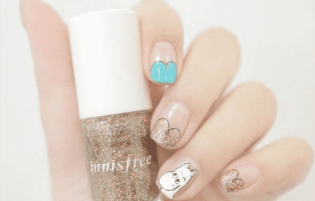 第四步:使用勾线笔沾取红色甲油在空隙处画出爱心,如图,照灯60秒。