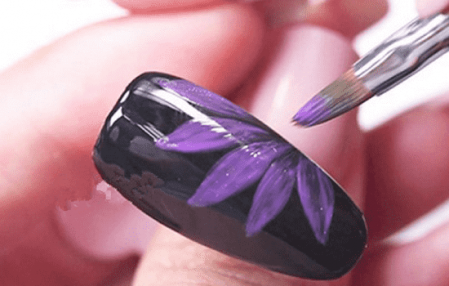 第一步:首先要完成黑色的打底,然后用圆笔沾取紫色甲油胶,把笔侧着,在甲面的右边画出花瓣,要注意花瓣的末端是尖的,而中间是宽的哦,照灯。