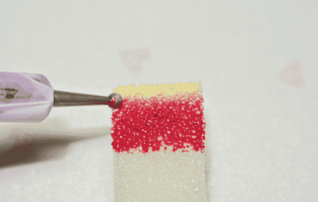 第二步:在海绵上,如图涂上甲油。从上到下分别涂抹红色、淡**甲油,中间位置用点珠笔沾取一些淡**甲油涂上去。