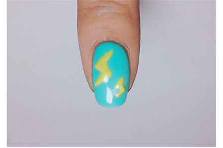 第一步:准备好所需的甲胶和工具,修剪指甲并打磨好甲面,刷上底胶,照灯60秒。为甲面均匀的涂上淡蓝色、粉色、蓝色和淡**底色,照灯60秒。为了颜色饱满再涂一遍,照灯60秒。用勾线笔蘸取淡**甲油在食指上画出闪电图案,照灯60秒。