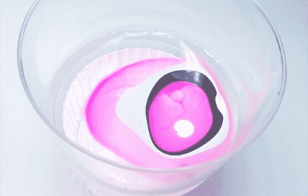 第二步:准备好一个装了水的水杯,并依次滴入玫红色、白色、黑色、玫红色和白色甲油,如图。