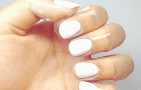 第一步:准备好所需的甲油和工具,刷上底油,照灯60秒。整甲刷上白色甲油,照灯60秒。为了颜色饱满再刷一遍,照灯60秒。在指甲周围贴上美甲胶带,照灯60秒。