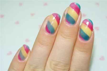 第二步:用三种不同颜色的搭配先画出45度的斜条纹,建议是稍微用贴纸贴下,这样线条会比较直,照灯60秒。