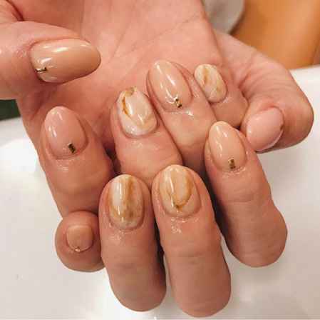和肤色相近的裸肉色,搭配柔和的棕色晕染甲,再用金色的小方块点缀,整体色调一致就会看起来很舒服,不会有杂乱无章的感觉。所以要搭配两种或以上的颜色时,一定要选择色调相同的。