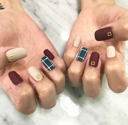 淡淡的裸棕色配上酒红色,秋天的感觉就很明显了。再用深牛仔蓝作为亮点,在上面手绘格纹,为沉闷的美甲增加了一分色彩。同时磨砂的质感尽显高大上。