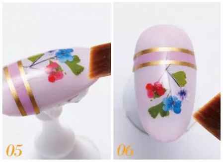 第二步:涂一层光疗胶,不照灯60秒。加入干花,照灯60秒。