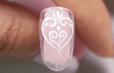 第一步:为甲面刷上银色闪粉甲油胶,照灯。用小笔沾取白色彩绘胶,在甲面上画出一个心形。