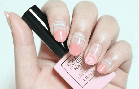 第三步:选择暗粉色甲油,在指甲前缘刷出反法式,照灯60秒。