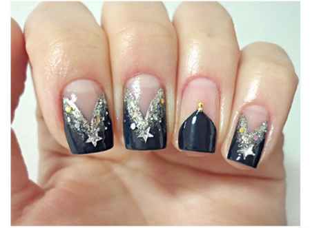 第五步:食指、中指和小拇指上刷上一层亮油,在适合位置上刷上粘上圆形和五角星亮片,如图所示,照灯60秒。