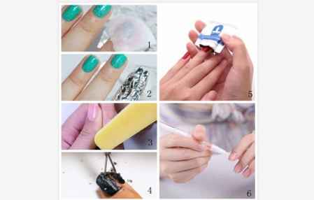 准备工具:卸甲水、卸甲锡纸、卸甲棉、卸甲刨、海绵锉、营养油。先用洗甲水拿化妆棉敷住指甲,然后用锡箔纸挨个包住,过一会儿就可以自己用工具磨掉了。然后使用海棉锉先磨掉光疗的封层。使用卸甲包把指甲包裹8-10分钟。取下卸甲包,用卸甲刨去除甲油胶。涂抹营养油即可。