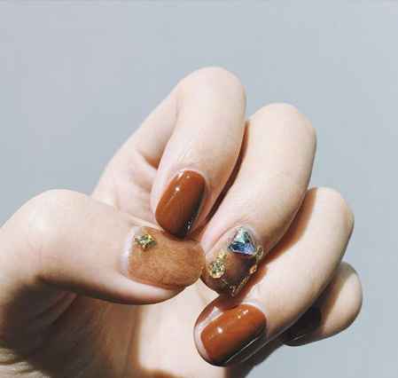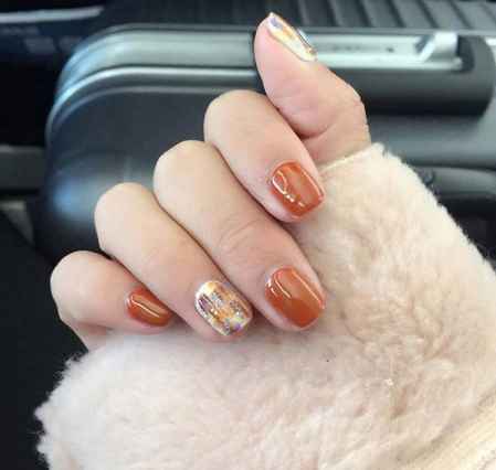 深色系橙色美甲也格外衬手部肤色,让皮肤看起来相当嫩白。此外,美甲颜色也很温暖治愈人。