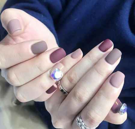 磨砂质感的美甲也是今年冬季一大流行款式,像深红色与灰色搭配也不错,显白又有撞色美。