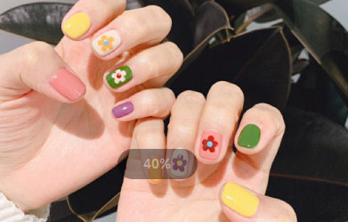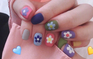 首先第一款就是超级火的花朵美甲啦,仙女们可以根据自己的喜好搭配颜色,不过最好是颜色鲜艳一点的会比较好看,然后再画上几朵小花就可以了。