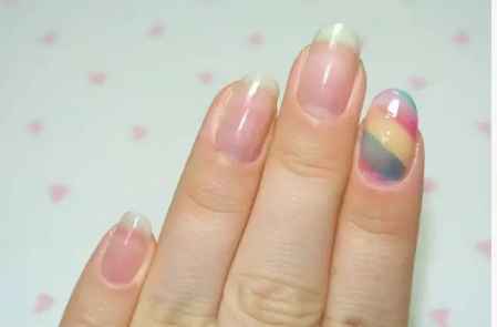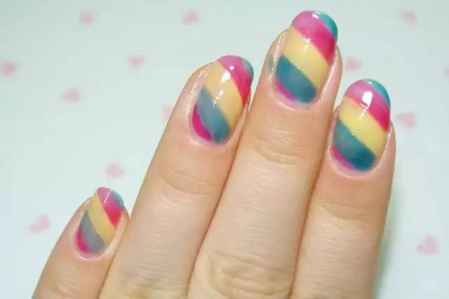 嘿嘿,很喜欢这种通透的感觉,用三种不同颜色的搭配先画出45度的斜条纹,建议是稍微用贴纸贴下,这样线条会比较直;