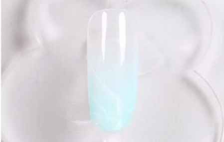 第一步:首先我们要把蓝色甲油胶和封层按2:1的比例调稀,用小笔沾取之后在甲面的前段刷出一片均匀的色块。清洁干净小笔,把色块边缘的颜色轻轻的往外拍,做成渐变的款式,照灯。