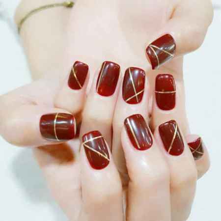 如果你觉得纯红色美甲太过单调了,不妨来试试这一款美甲,纯红色加金色线条组合,时尚大气又很显女人味。