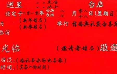 中式请柬的信封中一般会有“送呈台启”的字样,“送呈台启”的含义就是邀请某人打开的含义。因此,应该在“送呈”后填写被邀请人的姓名,要注意填写姓名全称,并冠以尊称,如:先生、女士等,如果邀请对方全家,就在名称后加写“全福”,如果请夫妻二人则写“双福”,如果分别写清邀请人的姓名,则要注意用“和”字或“暨”字连接,不要使用“、”“,”这类的标点符号。“台启”之后不用写字。