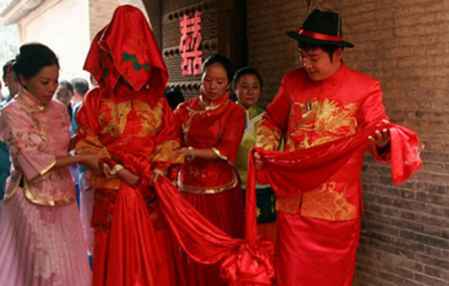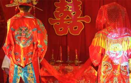 现在的中式婚礼新郎一般穿状元袍。状元袍是由红色的九品官服变化而来,帽子为乌纱帽,插宫花。