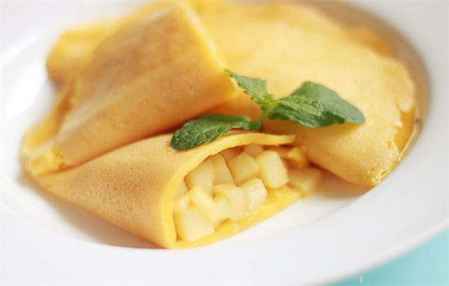 5.平底锅开小火,刷上一层薄油,倒入一半的蛋糊,煎至蛋皮表面刚凝固的时候,在1/4处铺上炒好的苹果丁。