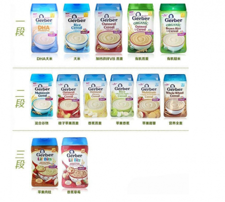 嘉宝2、3段米粉:适合6以上的宝宝,以全麦粉为基本原料,同时加入维生素A、维生素C,这能维持正常的造血机能,有维生素B1、生物素,能提高身体的免疫力。不含任何有害成分,米粉完成采用水解工艺,更易冲泡。