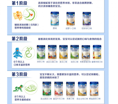 进口版的嘉宝米粉将产品分为7大阶段,即:胎儿、新生、学坐、**直坐、爬行、学步、2岁以上学步阶段。嘉宝的产品右上角会有标示: