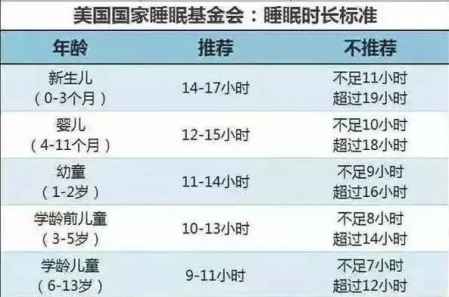 上图中显示,学龄儿童前儿童应该保证10~13小时睡眠,学龄儿童应该每天保证有9~11小时的睡眠。