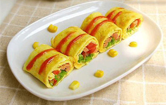 4、倒入蛋液,待蛋液即将凝固时将蛋饼卷起。煎成金**,出锅切段即可。