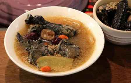 黄豆猪手汤里的黄豆一定要是川军豆。主要有:猪手+川军豆+枸杞+黄芪+当归+天麻草+葱+姜,一路入锅,加白开水,武火煮5分钟后转小火。
