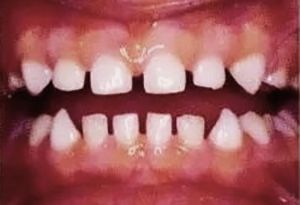 情况越来越严重,家长开始着急,村头摆地摊“100块种牙”的老大爷又说了:“这算事儿吗?换牙就好了,一点不影响!”于是,牙齿就变成这样了: