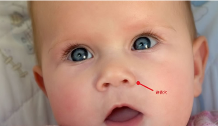 7.如果宝宝左侧鼻子不通气可右卧,同样右侧不通气可左卧;也可用手指轻按鼻翼两侧的迎香穴1~2分钟,按摩完后喝一杯热开水,可很快缓解甚至消除鼻塞反应。