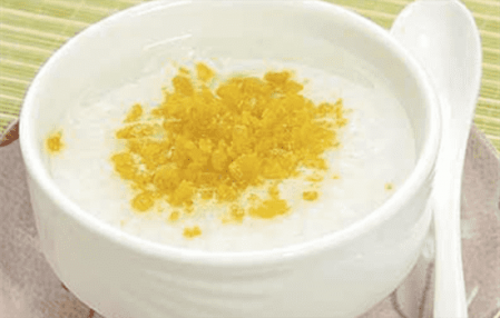 3. 将蛋黄放入碗内,研碎后加入粥锅内,同煮几分钟即成。