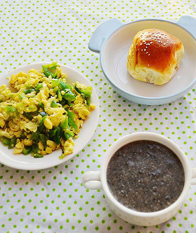 7、肉松面包+山药黑豆核桃杏仁芝麻糊+青椒炒蛋