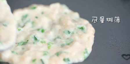 7、开小火,锅内刷少许油,舀入面糊,尽量将面糊摊薄一些,煎至底部凝固