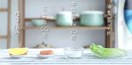 橙子1/4个、三文鱼60g、中筋面粉30g、油麦菜2片