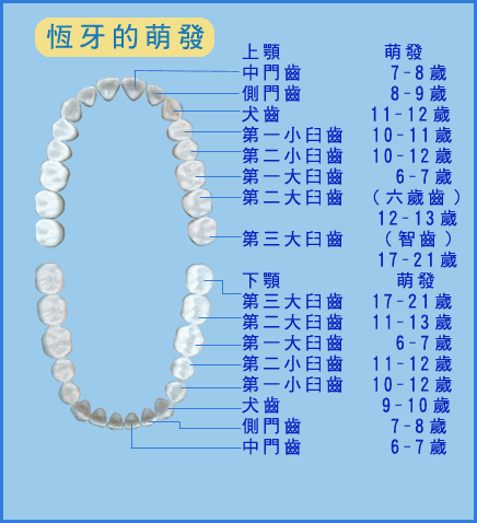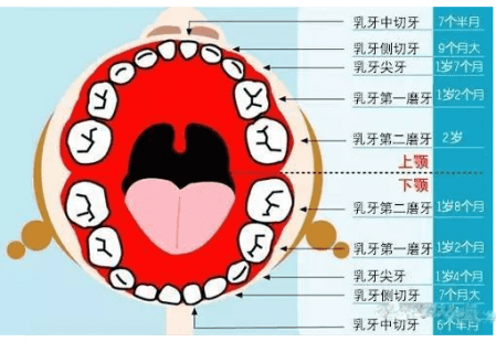 乳牙萌出会遵循一定的顺序(参考下图),但不必过分拘泥于此,萌牙的顺序并不影响牙齿的发育,2~3岁出齐20颗乳牙。