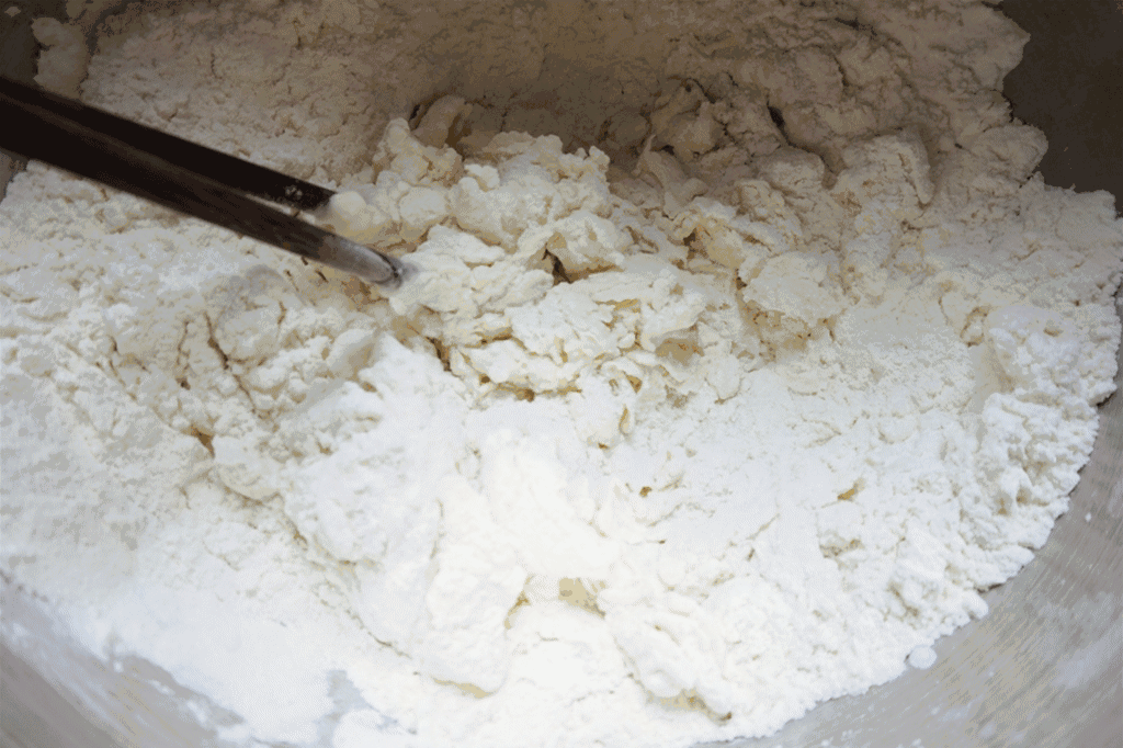2. 酵母水混合面粉和白糖。用酵母水搅匀,开始进一步揉面, 一定要有耐心,温水一点一点的加入,开始用筷子搅成雪花状的面絮,再慢慢揉成偏硬的面团。