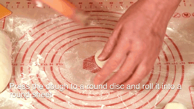 5. 包出包子的形状。放入自己喜欢吃的包子馅儿,素的肉的都可以,想包出漂亮的圆褶形状,手法如下。