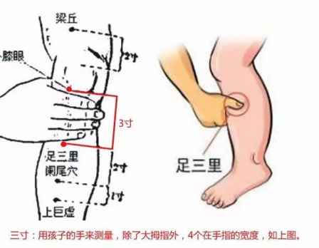 揉足三里:穴在外侧,膝眼下3寸,胫骨外侧约一横指处,以拇指端按揉之。