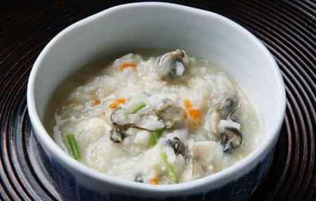 材料:鲜牡蛎肉100g、香米100g、五花肉50g、蒜茸15g、香葱末(15g)、白胡椒粉(3g)。