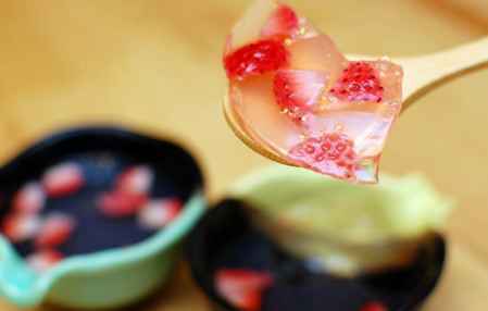 材料:洋菜粉5g,水500cc,白砂糖30g,草莓8颗。